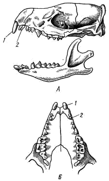 Череп широкий и короткий. Передний край твердого нёба имеет глубокую выемку, так как межчелюстные кости недоразвиты. Поэтому между резцами левой и правой сторон верхних челюстей есть промежуток.Резцы мелкие, средние резцы верхней челюсти отсутствуют. Клыки большие, острые. За клыками расположены 1—2 мелких конических малых переднекоренных и далее один одновершинный большой переднекоренной зуб. Затем следует до 3 многовершинных заднекоренных зубов