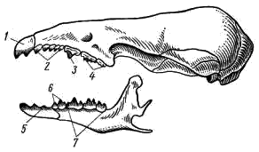 5 — нижний резец, 6 — нижние промежуточные зубы,