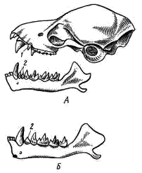 Череп ушана (А) и нижняя челюсть широкоушки (Б):