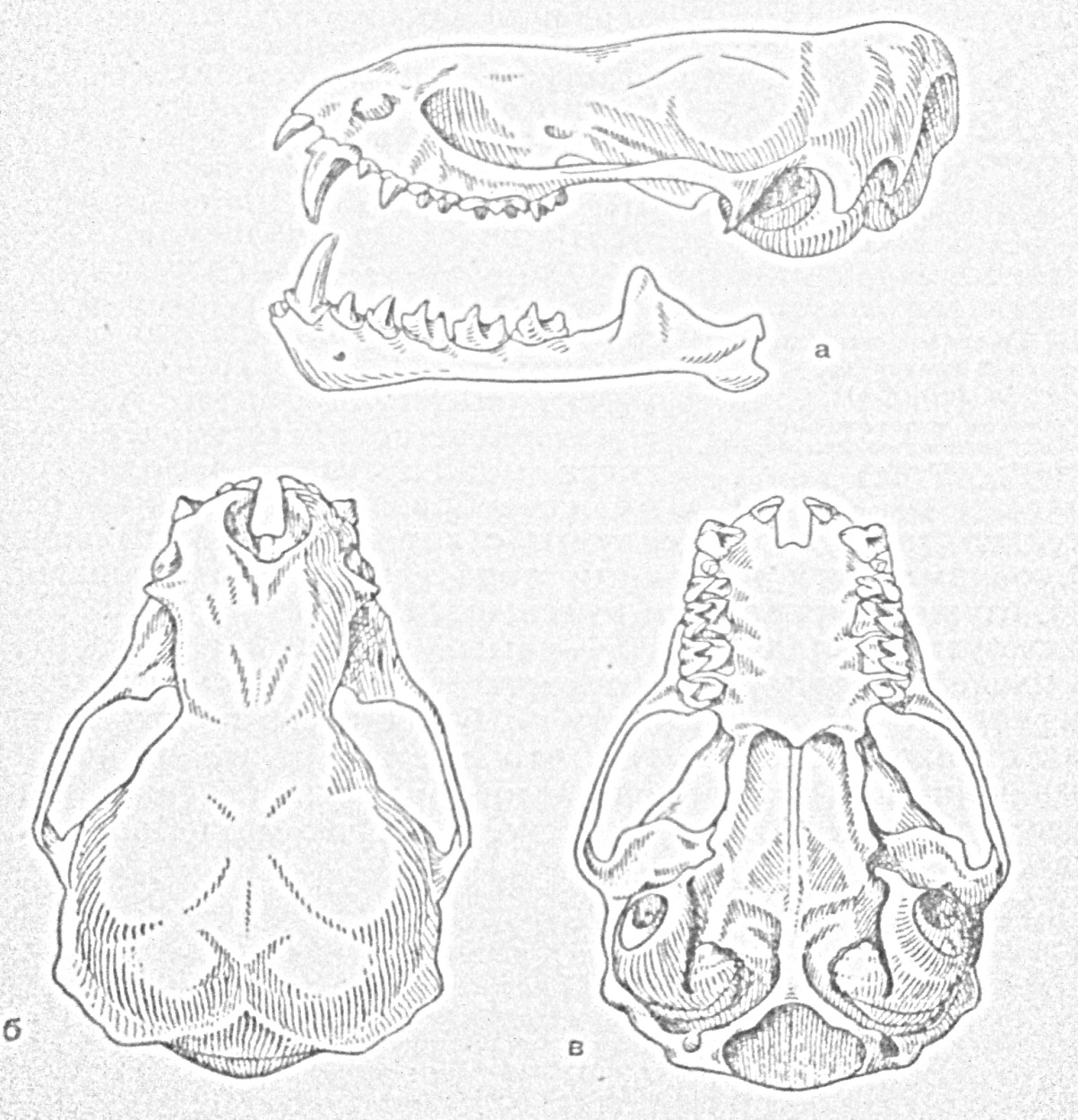 Скуловые дуги хорошо развиты и широко расставлены, так что скуловая ширина больше ширины черепа в слуховой области.