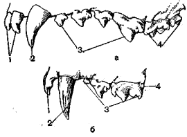 1 — резцы; 2 — клыки; 3 — переднекоренные; 4 — заднекоренные.