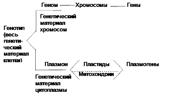Генетическому материалу хромосомного набора (геному) соответствует плазмон, включающий весь генетический материал цитоплазмы. Подобно генам хромосом, в структурных элементах цитоплазмы (пластидах, митохондриях, центросомах, основном ее веществе) находятся материальные носители нехромосомной наследственности. Любая единица цитоплазматической наследственности, соответствующая единице хромосомной наследственности (гену), называется плазмогеном.