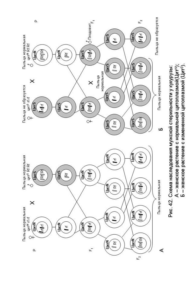 В результате изучения и обобщения экспериментального материала по наследованию мужской стерильности возникло представление о том, что это свойство обусловлено взаимодействием цитоплазмы и генов хромосом, составляющих вместе генетическую систему. Цитоплазма, обусловливающая стерильность пыльцы, получила обозначение ЦитS, а цитоплазма, дающая растение с фертильной пыльцой – ЦитN. Существует локализованный в хромосомах доминантный ген Rf (от начальных букв restoring fertility – восстанавливающий фертильность), который, не изменяет структуры и специфичности стерильной цитоплазмы, в то же время препятствует ее проявлению (РЧС-42). Плазмогены мужской стерильности проявляют свое действие только в сочетании с рецессивными аллелями этого гена. Следовательно, только сочетание ЦитS rf rf может обусловить развитие мужской стерильности. Фертильная пыльца образуется на основе нормальной цитоплазмы в сочетаниях - ЦитN Rf Rf, ЦитN Rf rf и ЦитN rf rf и на основе стерильной цитоплазмы в сочетаниях ЦитS Rf Rf и ЦитS Rf rf. Таким образом, наследование ЦМС по материнской линии возможно только в скрещиваниях следующих линий (рис. 42):