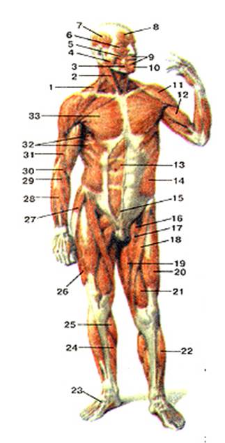 Рисунок 77. Мышцы передней поверхности тела человека. Общий вид. 1 - трапециевидная мышца; 2 - грудино-ключично-сосцевидная мышца; 3 - мышца. опускающая угол рта; 4 - жева-тельная мышца; 5 - большая скуловая мышца; 6 - круговая мышца глаза; 7 - височная мышца; 8 - переднее брюшко надчерепной мышцы, 9 - круговая мышца рта; 10 - мышца, опускающая нижнюю губу; 11 - дельтовидная мышца, 12 - двуглавая мышца плеча; 13 - прямая мышца живота; 14 - наружная косая мышца живота; 15 - пирамидальная мышца; 16 - гребенчатая мышца; 17 - длинная приводящая мышца бедра; 18 - портняжная мышца; 19 - большая приводящая мышца бедра; 20 - прямая мышца бедра; 21 - медиальная широкая мышца бедра; 22 - передняя большеберцовая мышца; 23 - сухожилия длинной мышцы, разгибающей пальцы стопы; 24 - камбаловидная мышца; 25 - икроножная мышца; 26 - латеральная широкая мышца бедра; 27 - мышца, напрягающая широкую фасцию бедра; 28 - мышца. разгибающая пальцы кисти; 29 - длинная лучевая мышца, разгибающая запястье; 30 - плече-лучевая мышца; 31 -плечевая мышца; 32 - передняя зубчатая мышца; 33 - большая грудная мышца.