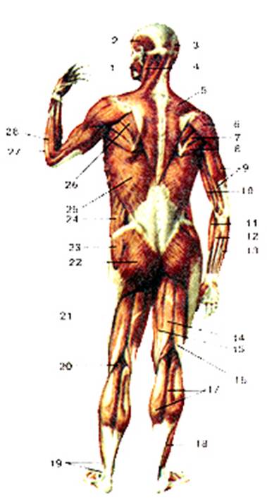 Рисунок 78. Мышцы задней поверхности тела человека. Общий вид. 1 - жевательная мышца; 2 - височная мышца; 3 - заднее брюшко надчерепной мышцы; 4 - грудино-ключично-сосцевидная мышца; 5 - трапециевидная мышца; 6 - дельтовидная мышца; 7 - малая круглая мышца; 8 - большая круглая мышца; 9 - трехглавая мышца плеча; 10 - двуглавая мышца плеча; 11- плечелучевая мышца; 12 - лучевой сгибатель запястья; 13 - локтевой сгибатель запястья; 14 - полусухожильная мышца; 15 - полуперепончатая мышиа, 16 - двуглавая мышца бедра; 17 -икроножная мышце; 18 - камбаловидная мышца; 19 - длинная и короткая малоберцовые мышцы; 20 - подколенная мышца; 21 - подвздошно-большеберцовый тракт; 22 - большая ягодичная мышца; 23 - средняя ягодичная мышца; 24 - наружная косая мышца живота; 25 -широчайшая мышца спины; 26 - подостая мышца; 27 - длинный лучевой разгибатель запястья; 28 - плече-лучевая мышца.