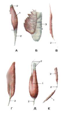 Рисунок 79. Мышцы различной формы. А — веретенообразная мышца, Б — широкая мышца, В —одноперистая мышца, Г — двуперистая мышца, Д —двуглавая мышца, Е — двубрюшная мышца. 1 - брюшко мышцы; 2 - сухожилие; 3 - апоневроз (широкое сухожилие).