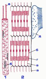 Рисунок 80. 1 — Схема строения мышечного волокна: а - миофибрилла; б - ядро. 2 — Схема строения миофибриллы: а - оболочка; б - миозин; в - актин; г - мостик между ними; д - нервное волокно.
