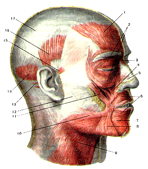 Рисунок 91. Мимические мышцы. Вид справа. 1 - лобное брюшко надчерепной (затылоч-но-лобной) мышцы; 2 - круговая мышца глаза; 3 - мышца гордецов; 4 - мышца, поднимающая верхнюю губу; 5 - носовая мышца (крыльная часть); 6 - круговая мышца рта; 7 - мышца, опускающая нижнюю губу; 8 - мышца, опускающая угол рта; 9 - подкожная мышца шеи; 10 -мышца смеха; 11 - большая скуловая мышца; 12 - жевательная фасция; 13 - задняя ушная мышца; 14 - затылочное брюшко надчерепной мышцы; 15 - передняя ушная мышца; 16 -верхняя ушная мышца; 17 - сухожильный шлем (надчерепной апоневроз) надчерепной мышцы.