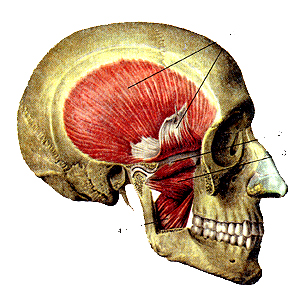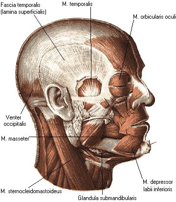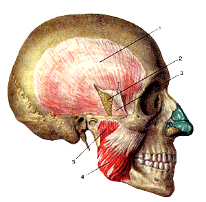 Височная мышца, m. temporalis, выполняет височную ямку, fossa temporalis. Она начинается от височной поверхности большого крыла клиновидной кости и чешуи височной кости. Пучки мышцы, направляясь вниз, конвергируют и образуют мощное сухожилие, которое проходит кнутри от скуловой дуги и прикрепляется к венечному отростку нижней челюсти. Действие: сокращение всех пучков мышцы поднимает опущенную нижнюю челюсть; задние пучки выдвинутую вперед нижнюю челюсть тянут назад. Иннервация: nn. temporales profundi (n. trigeminus). Кровоснабжение: aa. temporales profunda et superficialis.