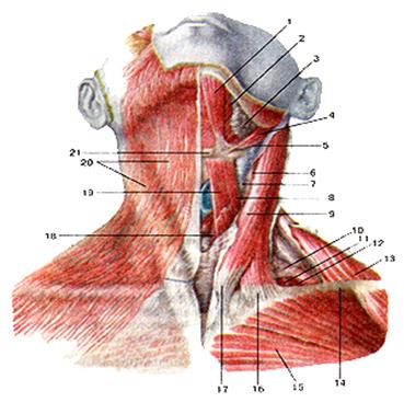 Рисунок 95. Поверхностные мышцы шеи. Вид спереди. 1 - переднее брюшко двубрюшной мышцы; 2 - челюстно-подьязычная мышца; 3 - подчелюстная слюнная железа; 4 - шило-подъязычная мышца; 5 - заднее брюшко двубрюшной мышцы; 6 - внутренняя яремная вена; 7 - обшая сонная артерия; 8 - верхнее брюшко лопаточно-подъязычной мышцы; 9 - грудино-ключично-сосцевидная мышца; 10 - нижнее брюшко лопаточно-подъязычной мышца; 11 -средняя лестничная мышца; 12 - задняя лестничная мышца; 13 - трапециевидная мышца; 14 - ключица; 15 - 6олыиая грудная мышца; 16 - ключичная часть грудино-ключично-сосцевидной мышцы; 17 - грудинная часть грудино-ключично-сосцевидной мышцы; 18 -грудино-щитовидная мышца; 19 - грудино-подъязычная мышца; 20 - подкожная мышца шеи; 21 - подъязычная кость.