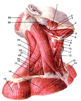 Рисунок 96. Мышцы шеи. Вид справа. I - жевательная мышца; 2 - шило-подъязычная мышца; 3 - заднее брюшко двубрюшной мышцы; 4 - подъязычно-язычная мышца; 5 -челюстно-подьязычная мышца; 6 - переднее брюшко двубрюшной мышцы; 7 - сухожильная петля, удерживающая сухожилие двубрюшной мышцы возле подъязычной кости; 8 -подьязычная кость; 9 - щито-подъязычная мышца; 10 - верхнее брюшко лопаточно-подьязычной мышцы; 11 - грудино-подъязычная мышца; 12 - грудино-ключично-подъязычная мышца; 13 - ключичная головка грудино-ключично-сосцевидной мышцы; 14 - грудинная головка грудино-ключично-сосцевидной мышцы; 15 - дельтовидная мышца; 16 - большая грудная мышца; 17 - ключица; 18 - нижнее брюшко лопаточно-подъязычной мышцы; 19 -задняя лестничная мышца; 20 - средняя лестничная мышца; 21 - передняя лестничная мышца; 22 - трапециевидная мышца; 23 - мышца, поднимающая лопатку; 24 - ременная мышца головы; 25 - околоушная слюнная железа; 26 - затылочное брюшко надчерепной мышцы.