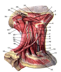 Рисунок 97. Мышцы шеи. Подкожная мышца шеи и грудино-ключично-сосцевидная мышцы удалены. Вид справа. 1 - челюстно-подъязычная мышца; 2 - подъязычно-язычная мышца; 3 -переднее брюшко двубрюшной мышцы; 4 - подъязычная кость; 5 - щито-подъязычная мьшща; 6 - нижний сжиматель (констриктор) глотки; 7 - верхнее брюшко лопаточно-подъязычной мышцы; 8 - грудино-подъязычная мышца; 9 - грудино-щитовидная мышца; 10 -щитовидная железа; 11 - пищевод; 12 - трахея; 13 - ключица (отрезана); 14 - 1-е ребро; 15 -паружная межреберная мышца; 16 - задняя лестничная мышца; 17 - средняя лестничная мышца; 18 - передняя лестничная мышца; 19 - нижнее брюшко лопаточно-подъязычной мышцы; 20 - длинная мышца шеи; 21 - мышца, поднимающая лопатку; 22 - длинная мышца головы; 23 - полуостистая мышца головы; 24 - длиннейшая мышца головы; 25 - грудино-ключично-сосиевидная мышца (отрезана); 26 - заднее брюшко двубрюшной мышцы; 27 - шило-подъязычная мышца; 28 - жевательная мышца; 29 - шило-язычная мышца.