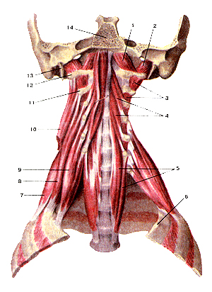 Рисунок 98. Глубокие мышцы шеи. Вид спереди. 1 - передняя прямая мышца головы; 2 -боковая (латеральная) прямая мышца головы; 3 - межпоперечные мышцы; 4 - длинная мышца головы; 5 - длинная мышца шеи; 6 - 1-е ребро; 7 - задняя лестничная мышца; 8 -средняя лестничная мышца; 8 - передняя лестничная мышца; 10 - мьшща, поднимающая лопатку (отрезана); 11 - II шейный позвонок; 12 - поперечный отросток атланта; 13 -шиловидный отросток; 14 - основная (базилярная) часть затылочной кости.