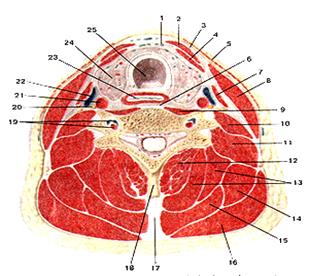 Рис. 99. Мышцы и фасции шеи на поперечном разрезе. 1 - предтрахеальная пластинка шейной фасции (средняя фасция шеи); 2 - грудино-подъязычная мышца; 3 - поверхностная пластинка шейной фаспии (поверхностная фасция шеи); 4 - грудино-щитовидная мышца; 5 -подкожная мышца шеи; 6 - предпозвоночная пластинка шейной фасции (предпозвоночная фасция); 7 - лопаточно-нодъязычная мышца; 8 - грудино-ключично-сосцевидная мышца; 9 -длинная мышца шеи; 10 - передняя лестничная мышца; 11 - средняя и задняя лестничные мышцы; 12 - полуостистая мышца шеи; 13 - полуостистая мышца головы; 14 - мышца, поднимающая лопатку; 15 - ременные мышцы головы и шеи; 16 - трапециевидная мышца; 17 - выйная связка; 18 - остистый отросток шейного позвонка; 19 - позвоночные артерия и вена; 20 - блуждаюший нерв; 21 - общая сонная артерия; 22 - внутреняя яремная вена; 23 -пищевод; 24 - щитовидная железа; 25 - трахея.