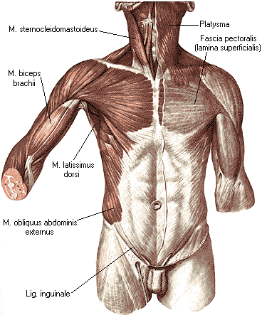 Наружная косая мышца живота, m. obliquus abdominis externus, плоская, широкая, начинается 8 зубцами от боковой поверхности 8 нижних ребер. На переднебоковой поверх-ности грудной клетки 5 верхних зубцов вклиниваются между нижними зубцами передней зубчатой мышцы, а 3 нижних — между зубцами широчайшей мышцы спины. Пучки наружной косой мышцы направляются косо вниз и кпереди и переходят в апоневроз. Верхняя часть апоневроза направляется к срединной линии и участвует в образовании передней стенки влагалища прямой мышцы живота. Пучки апоневроза этой мышцы, как и всех широких мышц живота, достигая срединной линии, переплетаются с пучками апоневрозов одноименных мышц противоположной стороны и, таким образом, участвуют в образовании белой линии живота, linea alba. Нижние пучки наружной косой мышцы прикрепляются к переднему отделу наружной губы подвздошного гребня. Средние пучки апоневроза перебрасываются над передней вырезкой тазовой кости и натягиваются между spina iliaca anterior superior и лобковой костью. При этом нижний край апоневроза, подворачиваясь назад и книзу, образует желоб. Этот утолщенный нижний край апоневроза, натянутый между spina iliaca anterior superior, с одной стороны, и tuberculum pubicum и symphysis pubica — с другой, носит название паховой связки, lig. inguinale. У лобковой кости пучки паховой связки расходятся и образуют две ножки. Одна из них, называемая медиальной ножкой, crus mediale, прикрепляется к симфизу, переходя частью пучков на противоположную сторону, а другая, латеральная, ножка, crus laterale, к tuberculum pubicum одноименной стороны. Между ножками образуется треугольная щель, верхнебоковой угол которой закруглен дугообразно идущими межножковыми волокнами, fibrae intercrurales. От внутренней части латеральной ножки отделяются пучки, —направляю-щиеся кнутри и медиально к передней пластинке влагалища прямой мышцы живота. Эти пучки получили название загнутой связки, lig. reflexum. Остающееся в форме овала отверстие в апоневрозе наружной косой мышцы живота, ограниченное двумя ножками паховой связки, межножковыми волокнами и загнутой связкой, является поверхностным паховым кольцом, anulus inguinalis superficialis. Через него выходит у мужчин семенной канатик, funiculus spermaticus, а у женщин — круглая связка матки, lig. teres uteri (в патологических случаях через него, кроме того, могут выпячиваться органы, образуя так называемую паховую грыжу, hernia inguinalis). От медиального конца латеральной ножки отделяется пучок, направляющийся кзади и латерально по краю верхней ветви лобковой кости. Этот пучок закругляет острый угол между паховой связкой и лобковой костью и получает название лакунарной связки, lig. lacunare. Позади заднего края наружной косой мышцы живота, над подвздошным гребнем, в стенке туловища отмечается участок треугольной формы, называемый поясничным треугольником, trigonum lumbale (см. Мышцы спины). Действие: является мышцей брюшного пресса; сокращаясь с одной стороны, вращает туловище в противоположную сторону; двустороннее сокращение при укрепленном тазе тянет грудную клетку и сгибает позвоночный столб. Иннервация: nn. intercostales (V-XII), n. lumbalis (Th5-Th12;L1). Кровоснабжение: аа. intercostales, thoracica lateralis, circumflexa ilium superficialis.