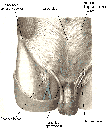 Поверхностное паховое кольцо, anulus inguinalis super ficialis, располагается над лобковой костью, имеет вид овального отверстия (2,5-3 х 1-2,5 см), ограниченного сверху и снизу соответственно медиальной и латеральной ножками паховой связки, crus mediale et crus laterale, латерально — fibrae intercrurales, медиально и книзу — lig. reflexum. В этом отверстии находится у мужчин семенной канатик, funiculus spermaticus, у женщин — круглая связка матки, lig. teres uteri. Отверстие доступно исследованию; при выпячивании концом мизинца кожи мошонки кверху и латерально можно прощупать вход в паховый канал. В норме он пропускает лишь конец мизинца; при больших размерах его состояние оценивают как расширение поверхностного пахового кольца. Глубоким паховым кольцом, anulus inguinalis profundus, является воронкообразное углубление поперечной фасции живота, ограниченное медиально межьямочковой связкой, lig. interfoveolare. Кнутри от этой связки задняя стенка пахового канала подкреплена волокнами нижнего края апоневроза поперечной мышцы живота, которые, загибаясь вниз, прикрепляются к бугорку и гребню лобковой кости, образуя паховый серп (соединительное сухожилие), falx inguinalis (tendo conjunctions). Медиальное глубокого пахового кольца залегают сосуды — нижние надчревные артерия и вены, a. et vv. epigastricae inferiores, которым соответствует plica umbilicalis lateralis, что важно помнить при необходимости рассечения глубокого пахового кольца в случаях ущемления грыж.