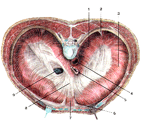 Рисунок 115. Диафрагма (diaphragma). Вид сверху. 1 - поясничная часть диафрагмы; 2 -пояснично-реберный треугольник; 3 - реберная часть диафрагмы; 4 - аорта (аортальное отверстие); 5 - пищевод (пищеводное отверстие); 6 - грудино-реберный треугольник; 7 -грудинная часть диафрагмы; 8 - сухожильный центр диафрагмы; 9 - нижняя полая вена (отверстие нижней полой вены).