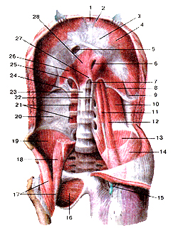 Рисунок 116. Диафрагма и мышцы задней стенки живота. Вид спереди. 1- грудинная часть диафрагмы; 2 - грудино-реберный треугольник; 3 - сухожильный центр диафрагмы; 4 - реберная часть диафрагмы; 5 - отверстие нижней полой вены; 6 - пищеводное отверстие; 7 - отверстие аорты; 8 - левая ножка поясничной части диафрагмы; 9 -пояснично-реберный треугольник; 10 - квадратная мышца поясницы; 11 - малая поясничная мышца; 12 - большая поясничная мышна; 13 - подвздошная мышца; 14 - подвздошная фасция; 15 - подкожное кольцо (бедренного канала); 16 - наружная запирательная мышца; 17 -подвздошно-поясничная мышца; 18 - большая поясничная мышца (отрезана); 19 - под-вздошная мышиа; 20 - внутрибрюшная фасция; 21 - межпоперечные мышцы; 22 - медиальная ножка диафрагмы (левая часть); 23 - медиальная ножка диафрагмы (правая часть); 24 -латеральная дугообразная связка (латеральная пояснично-реберная дуга); 25 - медиальная дугообразная связка (медиальная пояснично-реберная дуга); 26 - правая ножка поясничной части диафрагмы; 27 - срединная дугообразная связка; 28 - поясничиая часть диафрагмы.