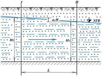 Движение начинается, если в разных частях водоносного пласта наблюдаются различные уровни воды, при этом она движется от мест с бóльшим уровнем (напором) – Н1 к местам с мéньшим напором Н2 (рисунок 3).