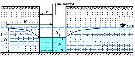 Расстояние от динамического уровня до дна выработки обозначается h иназывается высотой столба воды в выработке после откачки.