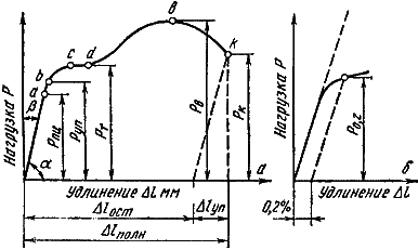 Статические испытания на растяжение. Наиболее распространенным методом оценки механических свойств является статическое испытание на растяжение по ГОСТ 1497, позволяющее одновременно определять характеристики прочности и пластичности. Испытания проводятся на специальных разрывных машинах, которые автоматически регистрируют первичную диаграмму растяжения в координатах «нагрузка P – абсолютное удлинение Δl». Однако для получения стандартизированных механических характеристик первичную диаграмму перестраивают в относительных координатах «напряжение σ – относительное удлинение δ», что нивелирует влияние геометрических размеров образца (рис. 6.7).
