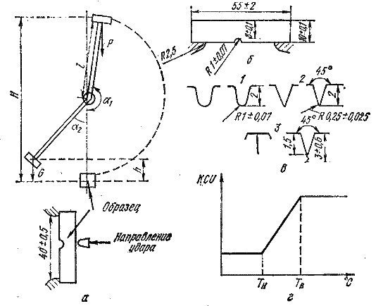 Рис. 7.3. Схема испытания на ударную вязкость: а – схема маятникового копра; б – стандартный образец с надрезом; в – виды концентраторов напряжений; г – зависимость вязкости от температуры