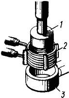 Рис. 16.2. Схема технологического процесса закалки ТВЧ: 1 – деталь, 2 – индуктор, 3 – спрейер для подачи охлаждающей жидкости