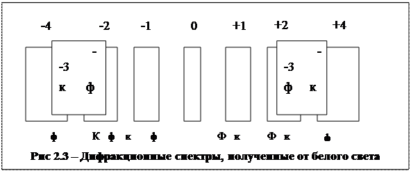 Экспериментальная установка состоит из линейки, на которой укрепляется дифракционная решетка перпендикулярно линейке, и движка со шкалой и щелью (рис. 22.2). За щелью устанавливается источник света (электрическая лампочка). При наблюдении глазом, расположенным близко к решетке, источника белого света, дифракционная картина представляет собой чередование спектров различных порядков, расположенных симметрично относительно центрального максимума. На рисунке 22.3 изображены схематически спектры разных порядков, даваемые решеткой при пропускании через нее белого света. В центре лежит узкий максимум нулевого порядка, у него окрашены только края. По обе стороны от центрального максимума расположены два спектра первого порядка, затем два спектра второго порядка и т.д. Положения красного конца спектра m-того порядка и фиолетового конца спектра (m+1)-го порядка определяются соотношениями (