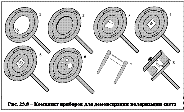 На рисунке 23.8 изображены приборы, с помощью которых проводятся описанные ниже эксперименты. Это: поляроид 1, черное зеркало 2, стопка стеклянных пластин 3, кристалл исландского шпата 4, препарат из целлофана 5, диафрагма 6, модели балки и рельса из органического стекла 7 и 8.