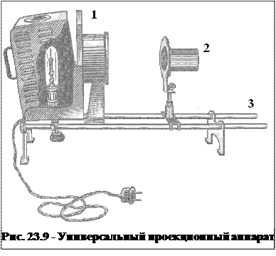Приборы, входящие в состав набора, совместно с универсальным проекционным аппаратом, позволят наглядно показать поляризацию света: при прохождении через поляроид и стопку стеклянных пластин; при отражении от плоского зеркала; а также двойное лучепреломление в кристалле исландского шпага, интерференцию поляризованных лучей и обнаружение анизотропии в органическом стекле. В состав универсального проекционного аппарата (рис. 23.9) входят конденсор 1, объектив 2 и оптическая скамья 3.
