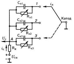 При «развертке» фотомишени коммутирующим (считывающим) лучом ее поверхность приобретает потенциал, определяемый режимом бомбардировки мишени. Трубка может работать в режиме медленных и быстрых электронов. Чаще используется режим медленных электронов. В режиме развертки медленными электронами потенциал правой стороны фотомишени приобретает в момент коммутации потенциал катода. Потенциал сигнальной пластины поддерживается постоянным, поэтому «под лучом» элементарные конденсаторы Сэ заряжаются до напряжения Uсп. При проекции на мишень оптического изображения сопротивления Rэшунтирующие элементарные конденсаторы Сэ изменяются, так как Rэ = f(Еэ): где Еэ— освещенность элементарного участка. При этом наиболее освещенным элементам мишени соответствует наименьшее сопротивление и, наоборот, темным участкам мишени — наибольшее сопротивление. В период между двумя коммутациями (длительность кадра) конденсаторы Сэ разряжаются через резистор Rэ с постоянной времени τр = CэRэ. Чем сильнее освещен участок мишени, тем меньше Rэ и быстрее разряжается Сэ. При этом потенциал обкладок конденсаторов Сэ, обращенных к лучу, увеличивается, приближаясь в пределе (в наиболее освещенных участках мишени) к потенциалу сигнальной пластины. На неосвещенных участках мишени он остается практически равным нулю. Таким образом, на поверхности мишени, обращенной к лучу, создается потенциальный рельеф — распределение потенциалов, соответствующее распределению освещенности по поверхности мишени.
