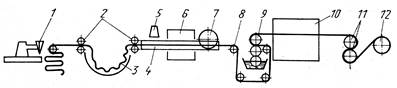 Трикотаж (1) в виде рукава через лотковый компенсатор (2) поступает на ножевую раклю (3) . При помощи которой на среднюю часть рукава тонкой полосой наносят аппрет (для закрепления кромок), обработанный таким образом трикотаж в виде рукава поступает в сушильную камеру (4). Далее при выходе из камеры происходит разрезание рукава дисковым ножом (5) по середине нанесенного аппрета. Далее рукав разворачивают на устройстве 6 и через лотковый компенсатор подают на валковую раклю 7 для нанесения адгезива на всю поверхность рукава. Если предстоит получение Винилискожи, то в качестве адгезива применяют пластизоль - низковязкую пасту на основе ПВХ-Е. Для фиксации адгезива трикотаж поступает в камеру желирования (Т=175 С), затем охлаждается и сматывается в рулон.