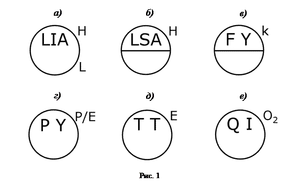 Первая позиция буквенного обозначения – позиция a на рис. 2 – это основное обозначение измеряемой (регулируемой) величины. Для обозначения измеряемых (регулируемых) параметров ГОСТом определены первые буквы соответствующих английских названий: T – температура; F – расход; L – уровень; P – давление; Q – концентрация; M – влажность; G – положение; S – скорость и т.д. (обозначения для других параметров – см. ГОСТ 21.404-85).