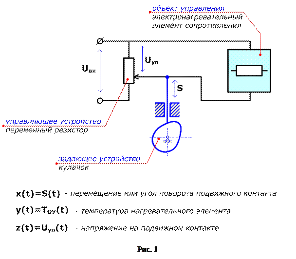 Рассмотрим разомкнутую систему управления температурой электронагревательного элемента (рис. 7). В качестве управляющего устройства в схеме используется переменный резистор, положение подвижного контакта которого определяет величину управляющего напряжения Uуп как долю входного напряжения Uвх, подаваемую на электронагревательный элемент. В бытовых электрообогревателях необходимая температура задается вручную с использованием регулятора или позиционного переключателя. В промышленных электронагревателях закон изменения температуры нагрева может задаваться профилем кулачка (см. рис. 7) [11].