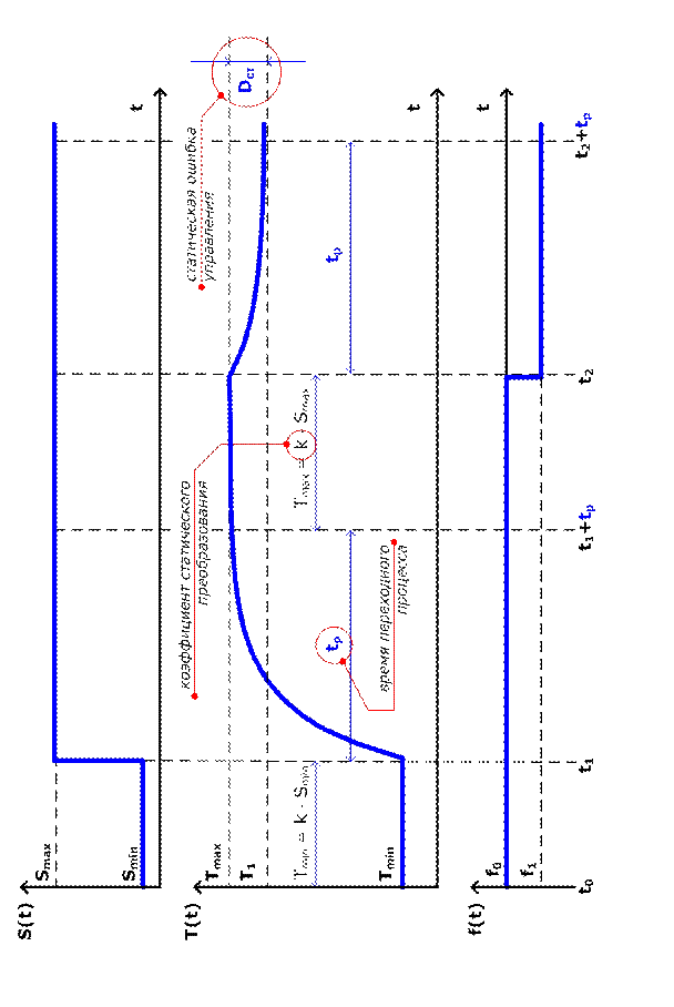 Рассмотрим ситуацию, связанную с возникновением в разомкнутой САУ ошибки управления в условиях действия возмущения на примере диаграмм работы разомкнутой САУ температурой нагрева бытового электрообогревателя с двухпозиционным переключателем (рис. 8). Пусть переключатель, кроме положения «выкл.» имеет два положения, соответствующие минимальной и максимальной температуре нагрева. До момента времени t0 электрообогреватель какое-то время был включен на минимальную температуру нагрева – положение переключателя соответствовало Smin, и температура уже достигла значения Тmin. Система находится в установившемся состоянии равновесия, которое описывается равенством: