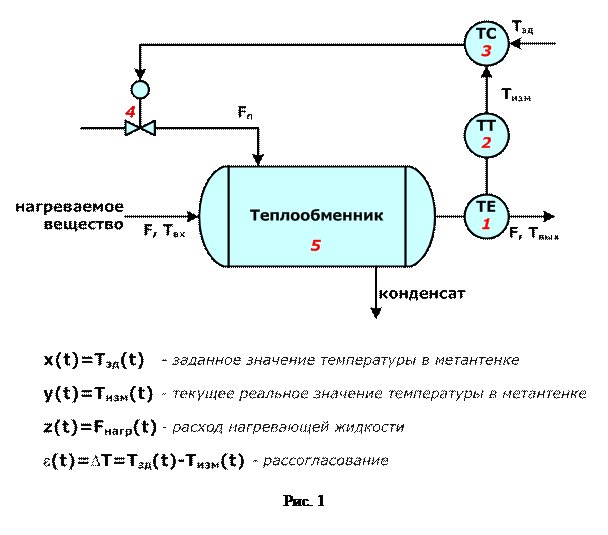Текущее значение температуры измеряется первичным преобразователем (чувствительным элементом) 1, сигнал с выхода которого подается в вторичный преобразователь 2, и далее, на регулятор 3, где сравнивается с заданным значением температуры. При наличии рассогласования e(t), в зависимости от его величины и знака, регулятор вырабатывает управляющее воздействие на регулирующий клапан 4, т.е. увеличивает или уменьшает расхода греющего пара Fп так, чтобы свести возникшее рассогласование к нулю.