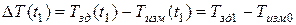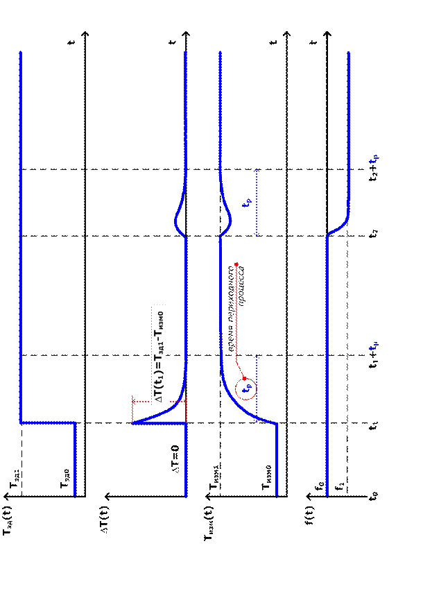 В момент времени t1 заданная величина температуры в соответствии с алгоритмом управления возрастает до значения Тзд1. Это приводит к нарушению равновесия в системе и возникновению рассогласования, которое имеет максимальное значение в момент ступенчатого изменения задающего воздействия:
