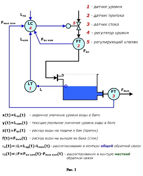 Рассмотрим в качестве примера комбинированную многоконтурную систему управления уровнем воды в проточном баке системы водоподготовки (рис. 16).