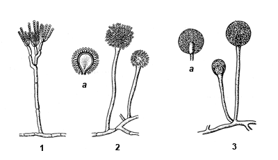Бесполое размножение может осуществляться также посредством эндо- и экзогенных спор. Эндогенные споры образуются внутри специализированных клеток — в спорангиях (например, у мукора - 3). Экзогенные споры, или конидии, возникают открыто на концах особых специализированных выростов мицелия, называемых конидиеносцами (например, у пеницилла - 1 и аспергилла - 2). Попав в благоприятные условия, спора прорастает, и из нее формируется новый мицелий.