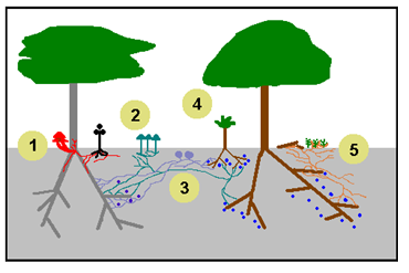 Микориза. Микориза представляет собой симбиоз (взаимовыгодное сосуществование) мицелия гриба и корня высшего растения. В формировании микоризы участвуют с одной стороны все голосеменные растения и некоторые цветковые, а с другой - такие группы грибов, как базидиомицеты, зигомицеты, аскомицеты, др. Благодаря грибам, увеличивается поверхность всасывания корневой системы, также соединения минеральных веществ поступают внутрь корня в легко усваиваемой форме. Гриб, в свою очередь, питается углеводами, фитогормонами, аминокислотами, получаемыми из корня высшего растения.