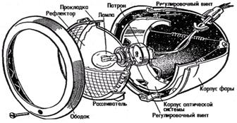 Рефлектор із скло- розсіювачем в зборі кріпиться ободом і гвинтами до корпусу оптичної системи, який, у свою чергу, кріпиться до основного корпусу фари регулювальними гвинтами і пружинами.