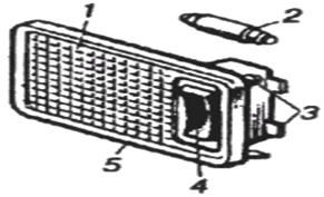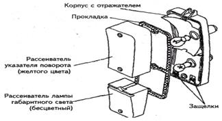 Підфарники складаються з штампованого або литого корпусу, скла, обода з прокладкою, патрона і лампи (мал. 9.8).
