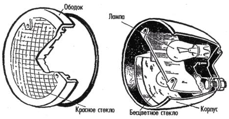 Задній ліхтар(мал. 9.4) вантажних автомобілів складається з корпусу, обода, заднього червоного і бічного безбарвного стекол, патрона і двохнитьової лампи. Одна нитка лампи через бічне скло освітлює номерний знак і дає сигнальне світло, інша нитка більшої світлової сили спалахує при гальмуванні.