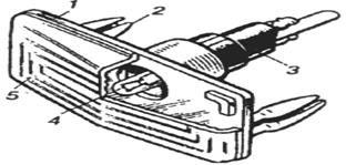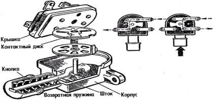 Ножний перемикач (мал. 9.10) складається з корпусу, кришки з контактами, контактного диска, штока і поворотної пружини.