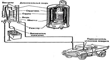 При замиканні перемикачем ланцюга сигнальних ламп струм від джерела поступає через обмотку, минувши контакти (вони розімкнені), на резистор і ніхромову струну, лівий якір, лампи і на «масу» автомобіля. Оскільки струм проходить через резистор і струну, напруження нитки лампи буде невелике, а струна під дією струму нагрівається, подовжується і дає можливість лівому якорю підтягтися до сердечника, а контактам замкнутися. При такому положенні струм на лампи поступає через замкнуті контакти, минувши резистор, і вони світитимуться яскравим світлом. Знеструмлена струна, охолоджуючись, коротшатиме і знову розімкне контакти; при цьому напруження нитки лампи знов зменшиться. Замикання і розмикання контактів, а отже, і мигання сигнальних ламп покажчиків поворотів, поки вони включені, відбуватиметься 60—120 разів на хвилину.