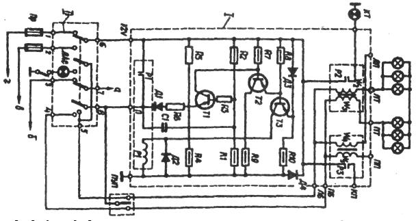 I — реле в зборі; II — вмикач аварійної сигналізації; ЛТ — лампи покажчиків повороту лівої сторони; ПТ — лампи покажчиків повороту правої сторони; ЛП, ПП — для підключення ламп покажчиків повороту причепа; КТ — контрольна лампа на щитку приладів; КП — для підключення контрольної лампи причепа; Р2, РЗ — реле контролю; W2, W3, W4, W5 — обмотки реле контролю; ПБ — права сторона; ЛБ — ліва сторона; Д1, Д4 — діод КД 105А; Т1— транзистор КТ 315А, Т2, ТЗ — транзистор МП25А; R1 — резистор подстроєчний МЛТ-0,5-6,8 кОм; R2— резистор МЛТ-0,5-8,2 Ом; R3, R7— резистор МЛТ-0,5-510 Ом; R4 — резистор МЛТ-0,5-240 Ом; R5 — резистор МЛТ-1-240 Ом; R6 — резистор МЛТ-0,5-51 Ом; R8 - резистор МЛТ-0,5-200 Ом; RK9 - резистор МЛТ-0,5-390 Ом; R10 — резистор МЛТ-0,5-1 кОм; С1 — конденсатор К-50-3-25-50; Р1 — реле старанне; ПУП— перемикач покажчиків повороту; ЛАС— лампа аварійної сигналізації; П — до середньої клеми перемикання; а — до вмикача габаритних вогнів; б— підключається в ланцюг при застосуванні дворежимних ліхтарів; у — до джерела живлення; г — до вмикача запалення К6. База транзистора Т1 по відношенню до емітера виявляється під позитивним потенціалом. Транзистор Т1, отже, і транзистори Т2 і ТЗ відкриваються. Виконавче реле Р1 спрацьовує, і за допомогою його контактів на сигнальні лампи подається «плюс» напруги джерел живлення. При цьому починається заряд конденсатора С1, струм якого утримує транзистор Т1 у відкритому стані. Після закінчення деякого часу величина струму заряду стане недостатньою для утримання транзистора у відкритому стані і він закриється. Транзистори Т2 і ТЗ теж закриються. Реле Р1 вимкнеться. Контакти розімкнуться. Конденсатор С1 почне розряджатися, утримуючи транзистор Т1 в закритому стані. Після розряду С1 цикл повториться. Діод Д1 служить для запобігання попаданню позитивного потенціалу напруги живлення на емітер транзистора Т1. Діод Д2 служить для шунтування струму ЕРС обмотки реле Р1. Діод ДЗ служить для отримання замикаючої напруги на базі транзистора ТЗ. Діод Д4 служить для шунтування зворотних викидів напруги живлення, що утворюються при зміні навантаження в схемі електроустаткуванні автомобіля.