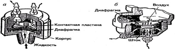 На автомобілях з пневматичним приводом гальмівних механізмів вимикач сигнальних ліхтарів гальмування встановлений на гальмівному крані або після нього. По своєму пристрою (мал. 9.14 б)цей вимикач подібний гідравлічному, але на відміну від нього на діафрагму чинить тиск не рідина, а стисле повітря.