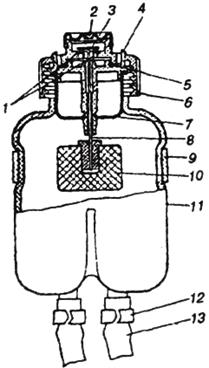 Датчик аварійного рівня гальмівної рідинивстановлюється на горловину компенсаційного бачка головного гальмівного циліндра або розташовується в роздільному бачку, сполученому з головним гальмівним циліндром шлангом (мал. 9.15). При пониженні рівня гальмівної рідини в компенсаційному бачку поплавець опускається і замикає контакти датчика, сигналізуючи водію про підтікання рідини в гальмівній системі.
