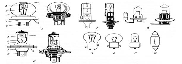 Автомобільна лампа (рис.9.16) складається з колби 1, однієї-двох ниток розжарювання 2 і 3, цоколя 7 з фокусувальним фланцем 5 чи без нього і виводів 6. Нитки розжарювання в двониткових лампах мають різне функціональне призначення, забезпечуючи роботу автомобільних фар головного освітлення в режимах близького і далекого світла.