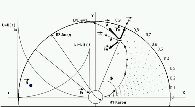 будут взаимно перпендикулярны, то траекторией движения заряженной частицы будет плоская кривая. Осуществить эти условия можно в ламповом диоде - двухэлектродной лампе, помещённой во внешнее магнитное поле. Электроды диода – подогреваемый катод и холодный анод выполнены в виде коаксиальных цилиндров. Как и в цилиндрическом конденсаторе, в межэлектродном пространстве диода имеется только радиальное распределение напряжённости электрического поля